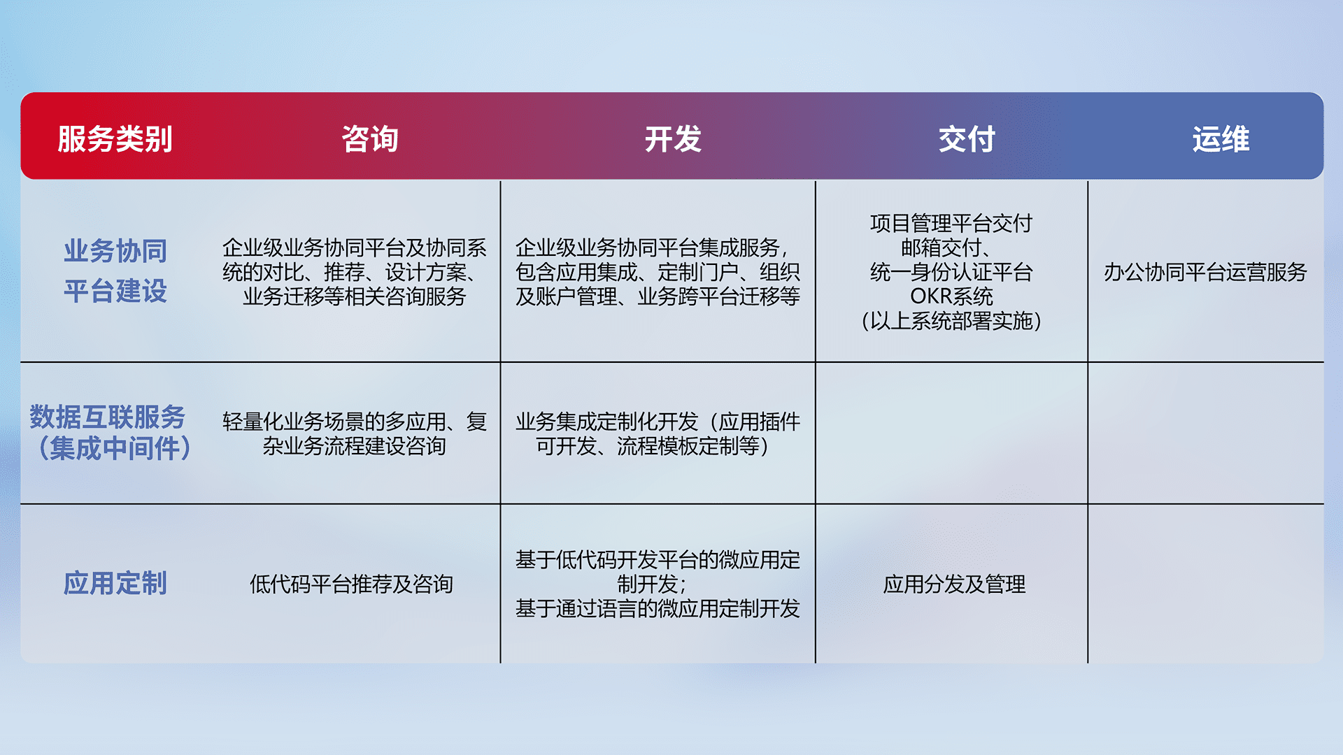针对钉钉、、、、企微、、、、IDaas等平台级产品提供产品的规划、、、、方案、、交付、、定制化开发等服务,,,,实现如统一协同办公、、、、智能客户服务、、、、混合会议管理、、、、智能数据查询、、、等业务场景,,实现数字化转型。。。