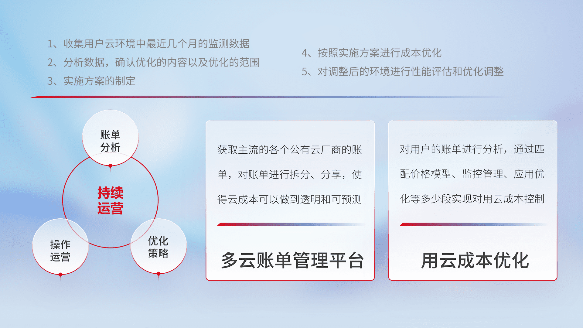 通过灵活运用多种自动化迁移工具,,帮助企业用户实现业务和数据高效 、、、、稳定的上云迁移和云上迁移,,,,采用自研多云纳管平台,,,,以中立管理模式,,解决多组织、、多云、、、多运维厂商的复杂关系的管理,,,,保证多云平台资源配置的一致性,,,实时掌控云资源运行数据,,运用智能化工具分析云资源多云平台的管理服务,,透明化管理成本支出,,,用云成本可预测、、、用云费用可优化、、、、云资源配额有据可依。。。。