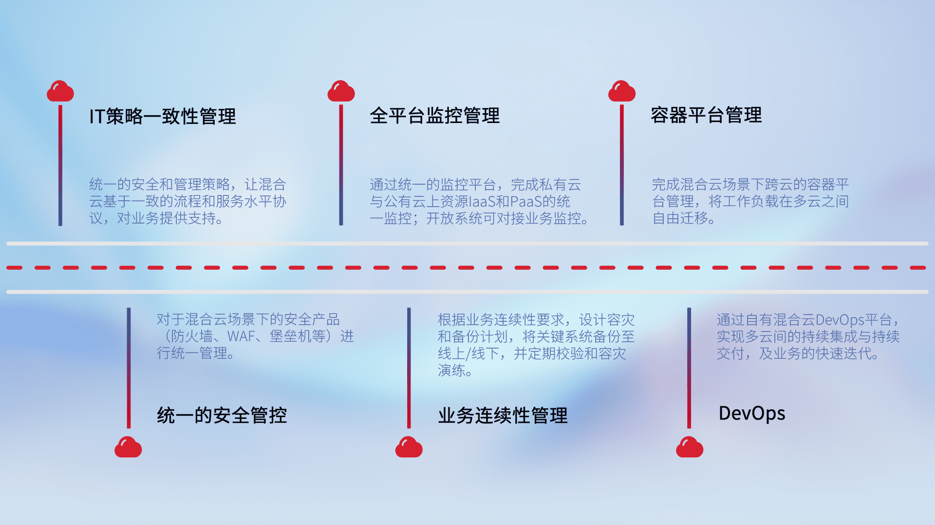 通过多云纳管,,,以统一的资源数据模型把客户的云资源进行抽象和封装,,,,进而实现对多云资源的统一操作,,,,保障云资源管理的可靠性、、、稳定性与可用性。。。量身定制化运维内容,,,配置、、、、开发运维、、、补丁管理、、、备份、、、、监控、、认证和访问管理、、审计和日常巡检等,,,,保障在用云过程中的可靠度,,,稳定度以及高可用率。。。。