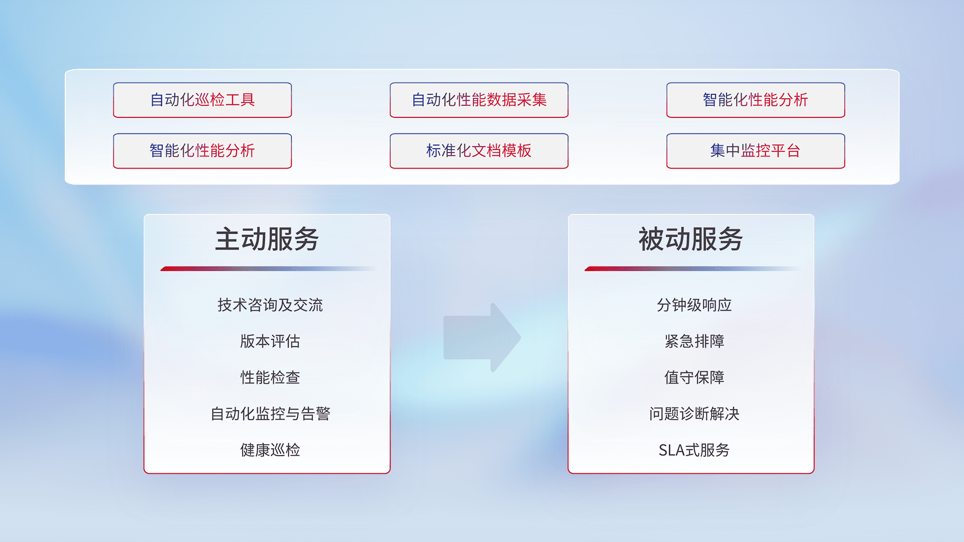 智能化工具和标准化文档,,,,保障服务质量,,,,提供主动服务(包含技术咨询、、版本评估、、性能检查、、、自动化监控与告警、、、、健康巡检)和被动服务包含(分钟级响应、、紧急排障、、值守保障、、、问题诊断解决、、SLA服务)。。